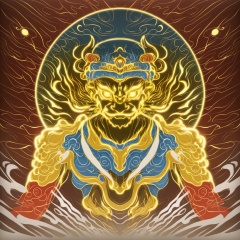 a projection of immortal,halo,<lora:eastern_mythology_xl:0.7>,golden line,tangka,mix,front view,