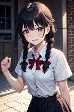 masterpiece,best quality,upper body,1girl,collared_shirt and flared_skirt as material1,色彩,cosplay,head out of frame,low twin braids,gmyh,small breasts,glowing eyes,happy,hatching \(texture\)