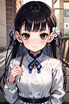 masterpiece,best quality,upper body,1girl,long sleeves,色彩,millipen \(medium\),lineup,hair rings,gmyh,small breasts,black eyes,:>,perspective