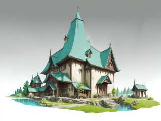 HEZI,Game single building scene,Conceptual art, European architectural design, top-down perspective, rock, gradient, gradient_background, grass, stairs, scenery, sitting, grey_background, water, 1girl, flower, weapon, statue, tree, brown_hair, outdoors, pillar, standing, waterfall, ruins,<lora:盒子系列——欧美单体概念场景:0.6>,