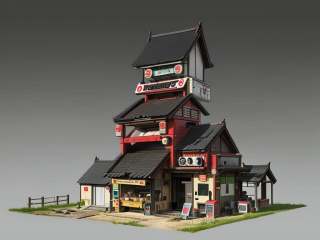 HEZI, Game single building scene, scenery, no humans, outdoors, building, television, architecture, lantern, east asian architecture, stairs, grass, air conditioner, window, rooftop, sign, grey background, plant, gradient background, railing, vending machine, door, gradient, radio antenna, table, house, ground vehicle, potted plant, shop, ladder, sitting, bench, fence, chair, motor vehicle, flag, paper lantern, cable, stool, road, chimney, sky,<lora:20231226-1703586512255-0007:0.7>,