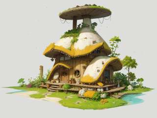 HEZI,Game single building scene,best quality,highly detailed,masterpiece,ultra-detailed,illustration,yishuhui,architecture,no_humans,solo,flower,food,grey_background,water,grass,plate,fish,watercraft,mushroom,boat,<lora:盒子系列——欧美单体概念场景:0.6>,