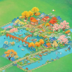(best quality),(masterpiece),illustration, garden, bird, bridge, building, bush, field, fish, grass, no_humans,, outdoors, tree, flower, water, stairs, fence, river, pond