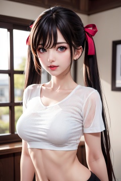 (1girl: 1.2), (breasts: 1.2), (underboob: 1.2), (navel: 1.2), (solo: 1.1), (twintails: 1.1), (low_twintails), (looking_at_viewer), crop_top, rating:safe, short_sleeves, long_hair, shirt, medium_breasts, hair_tie, bangs, upper_body, stomach, lips, black_shirt, collared_shirt, realistic, hair_over_shoulder, closed_mouth, blunt_bangs, midriff