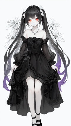 (black greyscale:1.2),(best quality),original,Perfect details,(ultra-detailed),illustration,(fantasy:1.1),(clear frame:1.1),(extremely detailed CG unity 8k wallpaper),(depth of field:0.66),(Livy Irwin),(full body:1.2333),((\\Black and White gradient color\\):1.2),(1girl:1.314),detailed face,(red eyes:1.233),(Smoky eye:1.2,dark eye circles:1.2)/=(black eyeshadow:1.34),(glowing eyes:1.133),(detailed eyes),(black hair:1.24),(very long hair),(messy hair:1.2),(low twintails, low tied:1.2),(strapless lace-trimmed lolita<Organza lace>),necklace,(light smile,closed mouth),plant,white flower,butterfly,white background,(sketch:1.35),(yubao:0.5),