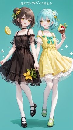 multiple girls,dress,lemon,2girls,blue hair,smile,lemon slice,socks,brown eyes,fruit,food,shoes,long hair,open mouth,hair bun,bangs,blush,closed mouth,green dress,:d,looking at viewer,brown hair,single hair bun,collarbone,frills,hair ornament,pantyhose,standing,short sleeves,bare shoulders,brown footwear,choker,short hair,yellow dress,hair between eyes,standing on one leg,blue background,full body,bow,frilled dress,see-through,green footwear,food print,yellow eyes,