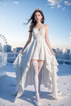 wearing a white dress,a girl wearing a wedding dress,white dress,ice and snow crown,high end long tail wedding dress,long legs,(white stockings:1.2),sky,cloud,ice castle,ferris wheel,looking_at_viewer,standing,<lora:Ice and Snow World_20231223195220-000010:0.7>,nikon lens,ice steps,1girl,solo,earrings,long hair,jewelry,realistic,brown hair,brown eyes,snowflakes,drifting snowflakes,