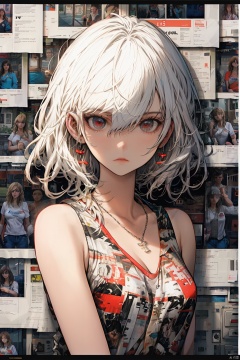 paper background, 1girl, jewelry, looking at viewer, earrings, upper body, bangs, breasts, closed mouth, sleeveless, necklace, solo, bare shoulders, shirt, medium hair, hair between eyes, white hair, sleeveless shirt, long hair, collarbone, medium breasts, cleavage, print shirt, expressionless