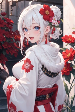 1girl, solo, blue eyes, long hair, smile, hair ornament, looking at viewer, flower, upper body, gloves, open mouth, hair flower, japanese clothes, blush, fingerless gloves, kimono, :d, blurry, braid, black gloves, bangs, earrings, hand up, blurry background, jewelry, red nails, white hair, fur collar, breasts, red flower, nail polish, ahoge, hair between eyes, long sleeves, tassel, floral print, depth of field, white kimono, fur trim, medium breasts, looking back, print kimono