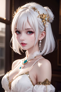 1girl, white hair,  hair ornament,  mature female,  shell, pearl, looking at viewer,  jewelry, detailed face, medium breasts