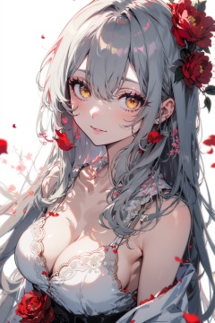 masterpiece,best quality,1girl,solo,looking at viewer,silver hair,yellow eyes,beautiful and detailed face,evil smile,upper body,collarbone,collarbone,large breasts,white long translucent night gown,expressionless,hair cover one eye,long hair,red hair flower,standing,blood,(plenty of red petals:1.35),white background,simple background,