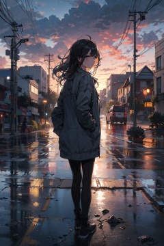 masterpiece,best quality,(ray tracing, cinematic lighting),ex-light,(central composition, Centered Composition and Symmetry:0.6),(back to camera:1.3),backlight,1girl,((solo)),black long hair,messy hair,jacket,pantyhose,rainy day,Cumulonimbus Cloud,(put hands in pockets),(outdoors, rain, sky, deserted streets, watered-down pavements, crossroad, fork in the road),tall buildings,bell towers,glass,reflections,streetlights,sunset,Tyndall Effect,