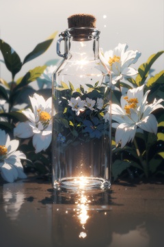 masterpiece,best quality,(ray tracing,cinematic lighting),glass bottle,close-up,white flower,blurry background,grey background,blurry foreground,simple background