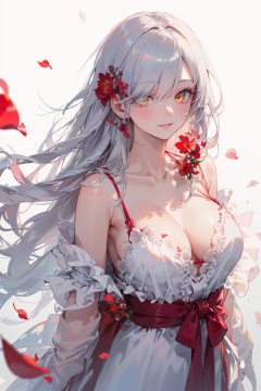 masterpiece,best quality,(realistic:1.2),1girl,solo,looking at viewer,silver hair,yellow eyes,beautiful and detailed face,evil smile,upper body,collarbone,collarbone,large breasts,white long translucent night gown,expressionless,hair cover one eye,long hair,red hair flower,standing,blood,(plenty of red petals:1.35),white background),simple background,