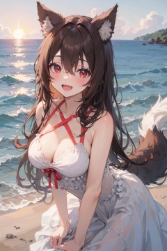 masterpiece,best quality,1girl,solo,looking at viewer,brown hair,hair between eyes,bangs,very long hair,red eyes,wolf ears,wolf tail,blush,open mouth,smile,:d,fang,large breasts,bare shoulders,(white sundress),upper body,leaning forward,outdoors,sun,sea,beach,day,blurry background