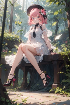 masterpiece,best quality,(ray tracing), full body, sitting, looking at viewer, 1girl, Short pink hair, star glint hair ornament, looking at viewer, smile, legs, white dress, black shoes, hat flower, lace, high heels, long hair, wind, leaf, tree, forest
