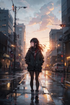 masterpiece,best quality,(ray tracing, cinematic lighting),ex-light,(central composition, Centered Composition and Symmetry:0.6),(back to camera:1.3),backlight,1girl,((solo)),black long hair,messy hair,jacket,pantyhose,rainy day,Cumulonimbus Cloud,(put hands in pockets),(outdoors, rain, sky, deserted streets, watered-down pavements, crossroad, fork in the road),tall buildings,bell towers,glass,reflections,streetlights,sunset,Tyndall Effect,