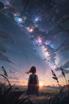 masterpiece,best quality,from behind,your name,1girl,solo,far away,silhouette,grass,nature,open field,landscape,night,shooting star,starry sky,