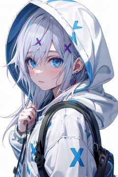 1girl, hood, solo, blue eyes, looking at viewer, long hair, hair ornament, white background, earrings, blush, jewelry, upper body, simple background, bangs, closed mouth, bag, hood up, white hair, hair between eyes, jacket, x hair ornament, hooded jacket, holding, from side, hoodie, backpack, hand up, looking to the side