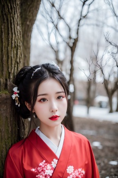 tree, 1girl, bare_tree, japanese_clothes, solo, black_hair, snow, kimono, makeup, red_lips