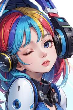 masterpiece,best quality,upper body,1girl,small breasts,mecha,rainbow order,minimalism,rounded corners,multicolored hair,eye reflection,covering eyes,close-up