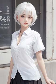 masterpiece,best quality,upper body,1girl,collared_shirt and flared_skirt as material2,色彩,calligraphy pen \(medium\),fading border,white hair,small breasts,wide-eyed,bored,cowboy shot