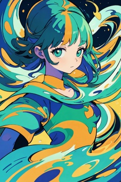 (masterpiece, best quality:1.2), (flat color:1.2),(2D:1.3),(colorful:1.2),looking at viewer,1girl,solo,upper body,floating colorful water,green theme