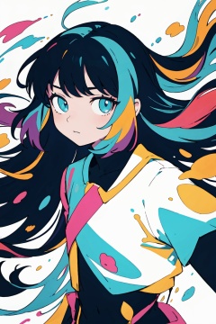 (masterpiece, best quality:1.2), (flat color:1.2),(2D:1.3),(colorful:1.2),looking at viewer,1girl,solo,upper body,floating colorful water,high contrast