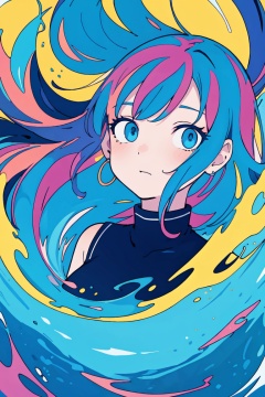 (masterpiece, best quality:1.2), (flat color:1.2),(2D:1.3),(colorful:1.2),looking at viewer,1girl,solo,upper body,floating colorful water,blue theme