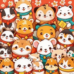 many animals, cute, poakl cartoon newyear style,best quality,masterpiece,,