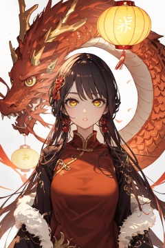 1girl, lantern, dragon, long hair, hand on own chest, chinese clothes, looking at viewer, upper body, eastern dragon, parted lips, red dress, paper lantern, dress, bangs, hair rings, breasts, solo, hair ornament, china dress, tassel, hand up, brown hair, sidelocks, teeth, black hair, medium breasts, orange eyes, yellow eyes