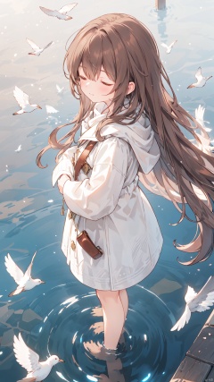 1girl, brown hair, long hair, closed eyes, (above ground), (water surface, reflection, surrounded by white birds), ((from above)), blurry, (full body, wide shot, panorama), (grey background), (shining, fog)