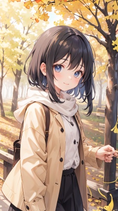 bpstyle,1girl,solo,outdoor,autumn leaves,forest,(ginkgo leaf), shot hair,smile,yellow clothes, bpstyle,tuyagirl