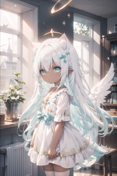 white hair, yellow eyes, aqua eyes, looking up, stockings, dark skin, long hair, hime cut, messy hair, floating hair, demon wings, halo, cross necklace, holy, divinity, shine, holy light, cat girl, (loli), (petite), solo, cozy anime, houtufeng, letterboxed