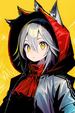 masterpicec,best quality,1girl, animal ears, solo, wolf ears, projekt red (arknights), yellow background, yellow eyes, hood, hair between eyes, wolf girl, jacket, looking at viewer, upper body, grey hair, simple background, hooded jacket, bangs, red jacket, ascot, shirt, hood up, fur-trimmed hood, closed mouth, long hair, animal ear fluff