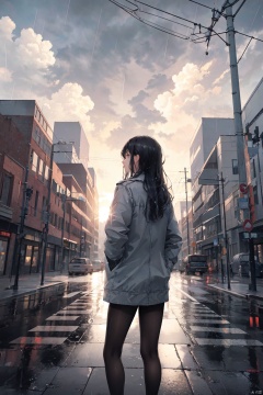 masterpiece,best quality,(ray tracing, cinematic lighting),ex-light,(central composition, Centered Composition and Symmetry:0.6),(back to camera:1.3),backlight,1girl,((solo)),black long hair,messy hair,jacket,pantyhose,rainy day,Cumulonimbus Cloud,(put hands in pockets),(outdoors, rain, sky, deserted streets, watered-down pavements, crossroad, fork in the road),tall buildings,bell towers,glass,reflections,streetlights,sunset,Tyndall Effect,