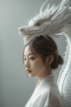 A girl, Oriental Dragon, gray background, blurry, close-up,sulong <lora:sulong1-000004:0.7>