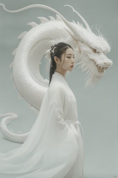 A girl, (Oriental Dragon:1.2), gray background, blurry, sulong ,solo