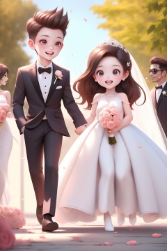 1girl,sqs,dress,1boy,flower,brown hair,smile,necktie,open mouth,brown eyes,holding hands,pants,long hair,white dress,wedding dress,petals,white footwear,bouquet,black necktie,blush,wedding,groom,walking,black pants,formal,pink flower,teeth,hair ornament,suit,hair flower,shirt,upper teeth only,chibi,hetero,:d,holding,short hair,white jacket,bride,looking at another,veil,spiked hair,shoes,aged down,bridal veil,<lora:sqs:0.8>,