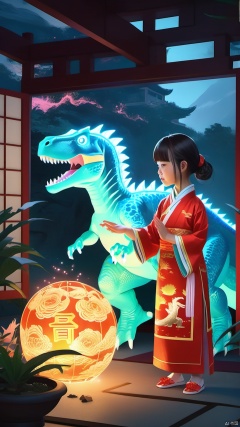 A girl in Chinese dress, summoning a glowing magical dinosaur