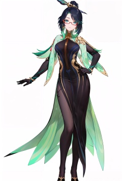8k, best quality, masterpiece, (ultra-detailed:1.1), (high detailed skin), (full body:1.2), white background, standing, looking at viewer, (solo:1.4), hand on hip, <lora:xianyun-v100:0.8:lbw=OUTALL>, xianyun, 1girl, ponytail, chinese clothes, (hair stick:1.2), hair ornament, glasses, jewelry, earrings, multicolored hair, black hair, dress, standing, gloves, green hair, red-framed eyewear, black pantyhose, (white background, simple background:1.5), (beautiful_face), ((intricate_detail)), clear face, ((finely_detailed)), fine_fabric_emphasis, ((glossy)), full_shot