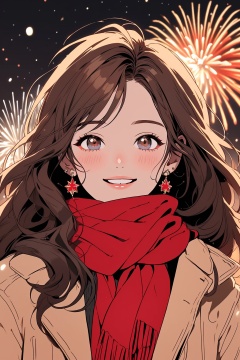 (best quality),(masterpiece),(ultra-detailed),illustration,8k wallpaper,best illustration,1girl,solo,scarf,red scarf,smile,fireworks,blush,long hair,looking at viewer,brown hair,upper body,parted lips,coat,sweater,night,jacket,jewelry,earrings,<lora:chgirlnewyear-0012:0.8>,
