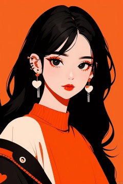 (best quality),(masterpiece),(ultra-detailed),illustration,8k wallpaper,best illustration,1girl, solo, jewelry, earrings, black hair, piercing, long hair, ear piercing, looking at viewer, black eyes, simple background, orange shirt, makeup, shirt, jacket, upper body, heart, sweater, red background, orange background, red lips, lipstick
