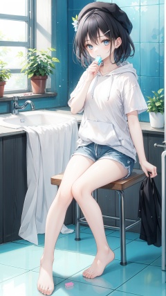 1girl,barefoot,tiles,hood,sitting,shorts,tile wall,indoors,short hair,hoodie,plant,cup,bathroom,holding,reflection,mirror,black hair,hair ornament,potted plant,holding cup,hood down,chair,short sleeves,sink,hairclip,knees up,washing machine,blue shorts,faucet,brushing teeth,tile floor,solo,towel,toothbrush,stool,bangs,hair between eyes,mug,white hoodie,hat,blush,drawstring,
