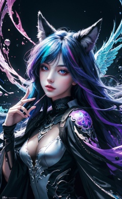 masterpiece,best quality,ultra high res,highly detailed,(psychedelic art:1.4),(woman, demon:1.3),(floating in dark mist:1.1),furry girl,anime furry women,((best quality)),((masterpiece)),((realistic)),(detailed),portrait,close up,young female,RAW photo,uhd,dslr,rainbow hair,high quality,realistic,photo realistic,dreamlikeart,lens flare,upper body,looking at viewer,animal focus,furry,wolf fursuit,1girl,cute,kawaii,lovely,fur,fur head,wolf head,narrow waist,wolf ears,black chocker,blush,paw,paw shoes,rainbow clothes,stunning gradient colors,no watermark signature,detailed background,woods,small lake with island,insanely detailed,visually stunning,wicked,hypnotic,alluring,cowboy shot,intricate,perferct shading,veil,beautiful,award-winning illustration,cosmic space background,ethereal atmosphere,ultra quality,beautiful girl,cosmical concept,rainbow strings,rainbow skin,rainbow bloody veins growing and intertwining out of the darkness,nailed wire,oozing thick blue blood,sharp neon,veins growing and pumping blood,vascular networks growing,green veins everywhere,yin and yang,glowing space,glowing stars,infinity symbol,dynamic pose,flying pose,glowing body,(rainbow aura:1.1),beautiful angel,clockwork,lightning,majestic,breathtaking,turtleneck dress,<lora:1111白皙质感:0.8>,