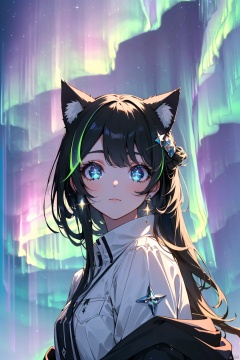 (((High quality image)))((((sparkling eyes)))(((beautiful starry sky)))((((beautiful aurora borealis))) cat ears, long black hair, clothes with diamonds.,, extremely detailled eyes, higrees, extremely detailled hairs, sharp focus, light particles, light reflects, light reflects, radient light, hair ornament,, most detalied shadows, hd quality, 8k