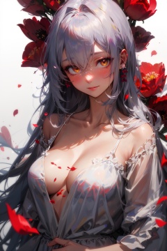 masterpiece,best quality,1girl,solo,looking at viewer,silver hair,yellow eyes,beautiful and detailed face,evil smile,upper body,collarbone,collarbone,large breasts,white long translucent night gown,expressionless,hair cover one eye,long hair,red hair flower,standing,blood,(plenty of red petals:1.35),white background,simple background,