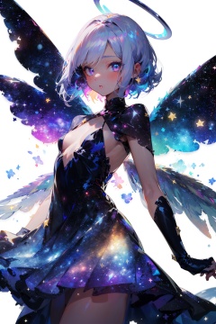 ((solo)),((cowboy shot)),(((a beautiful girl))),((small_breasts)),((looking at viewer)),(galaxy adorns colorful wings),(((starry_wings,galaxy_wings):1.3)),(galaxy adorns colorful dress:1.3),(Glowing halo),(beautiful eyes),white hair,((white background:1.4)),((standding)),