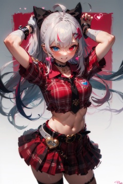(masterpiece:1.2),best quality,PIXIV,Sweet girl,1girl,solo,long hair,smile,skirt,gloves,heterochromia,hair ornament,fingerless gloves,bow,hair bow,jewelry,black gloves,plaid skirt,multicolored hair,fishnets,looking at viewer,shirt,plaid,earrings,black bow,nail polish,belt,heart,red shirt,short sleeves,grin,crop top,single glove,bangs,red skirt,cowboy shot,arms up,bandages,hairclip,choker,ahoge,black nails,signature,pink eyes,necktie,bandaged arm,very long hair,spikes,midriff,collar,pleated skirt,black choker,black necktie,pink hair,polka dot,blush,ear piercing,miniskirt,grey eyes,grey hair,piercing,hands up,multicolored nails,heart hair ornament,streaked hair,black collar,black belt,white hair,red eyes,red nails,frills,safety pin,x hair ornament,ring,breasts,buckle,badge,chain,spiked bracelet,character name,bracelet,