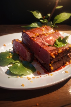 masterpiece,best quality,(ray tracing,cinematic lighting),realistic,close-up,still life,no humans,food,meat,leaf,vegetable,plate